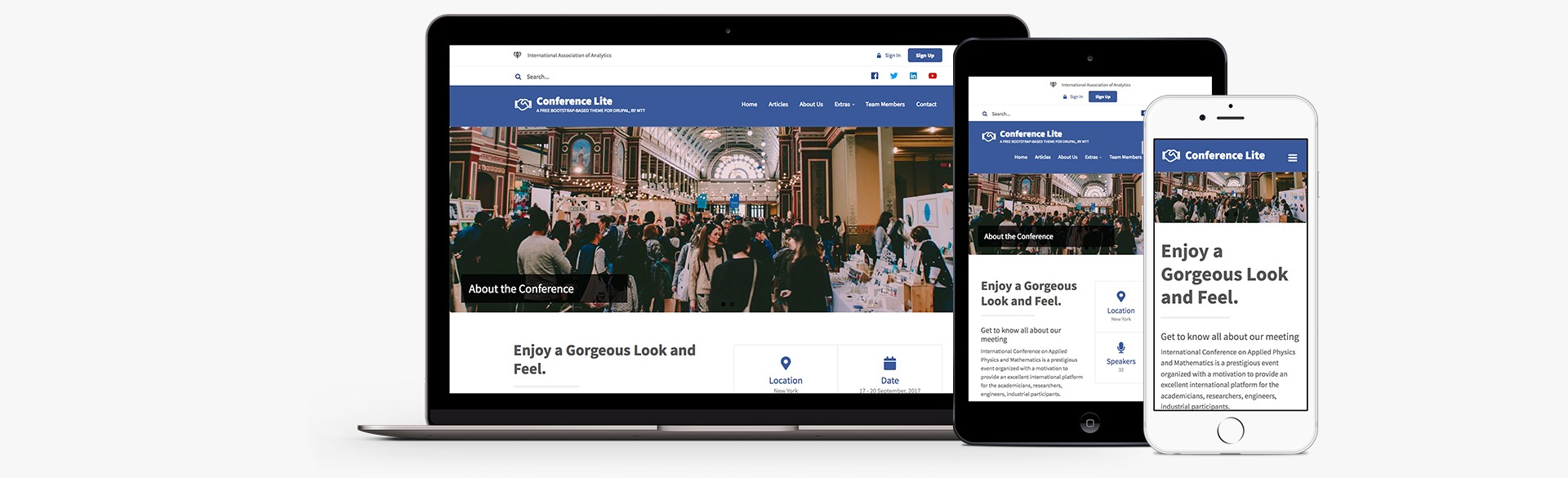 Conference Lite is a free Drupal theme to apply on your Drupal website. You can use it as is or customize it for your personal or commercial projects, without limitations. Although attribution is very much appreciated it is not required. Take a look at the Live demo.