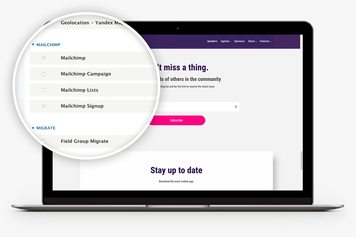 Integrates with Mailchimp using the Drupal module for Mailchimp, providing an out-of-the-box solution for your email marketing needs.