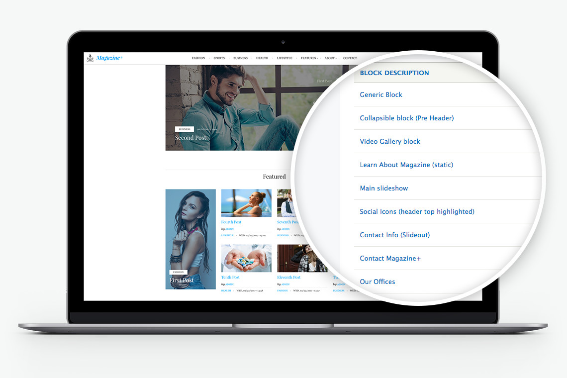 Designed specifically for the greatness introduced by Drupal 10, Magazine+ makes use of the new Block functionality and flexibility with a ton of regions, and lots of built-in blocks that you can use over and over.