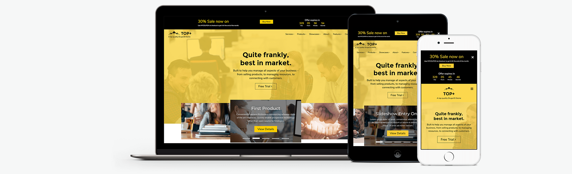 Why build Drupal stuff from scratch? Top+ is a great time-saver, with its special Content Types, including: “Service”, “Product”, “Team member”, “Testimonial” and “Client Showcase”, so you can quickly and easily present what’s great about your business, products and services.