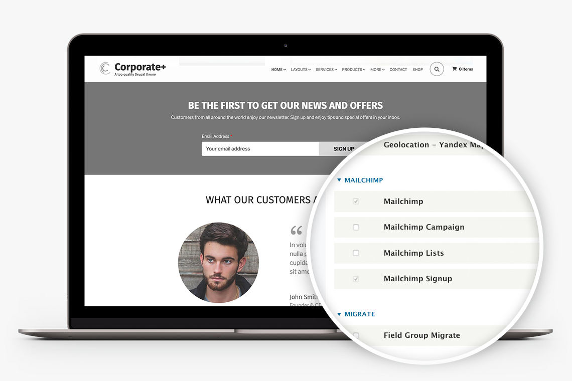 Integrates with Mailchimp using the Drupal module for Mailchimp, providing an out-of-the-box solution for your email marketing needs.