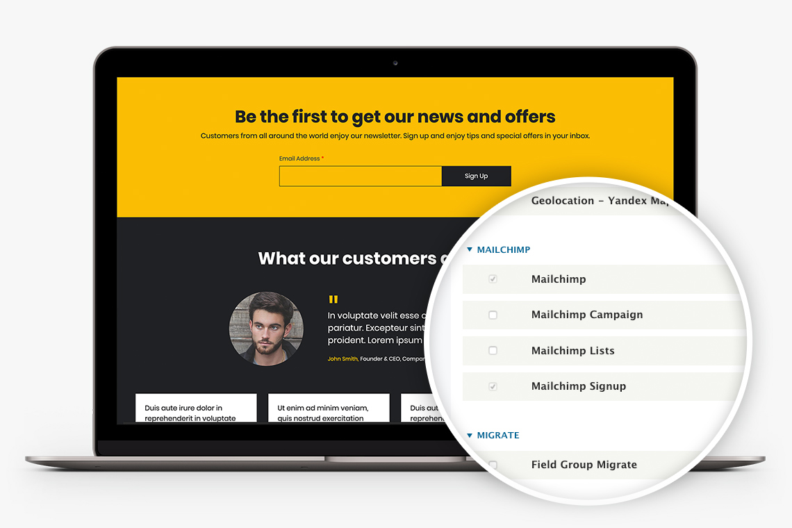 Integrates with Mailchimp using the Drupal module for Mailchimp, providing an out-of-the-box solution for your email marketing needs.