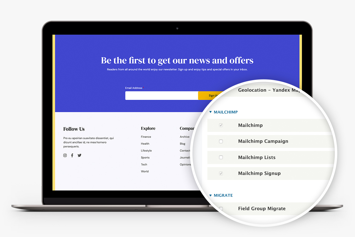 Integrates with Mailchimp using the Drupal module for Mailchimp, providing an out-of-the-box solution for your email marketing needs.