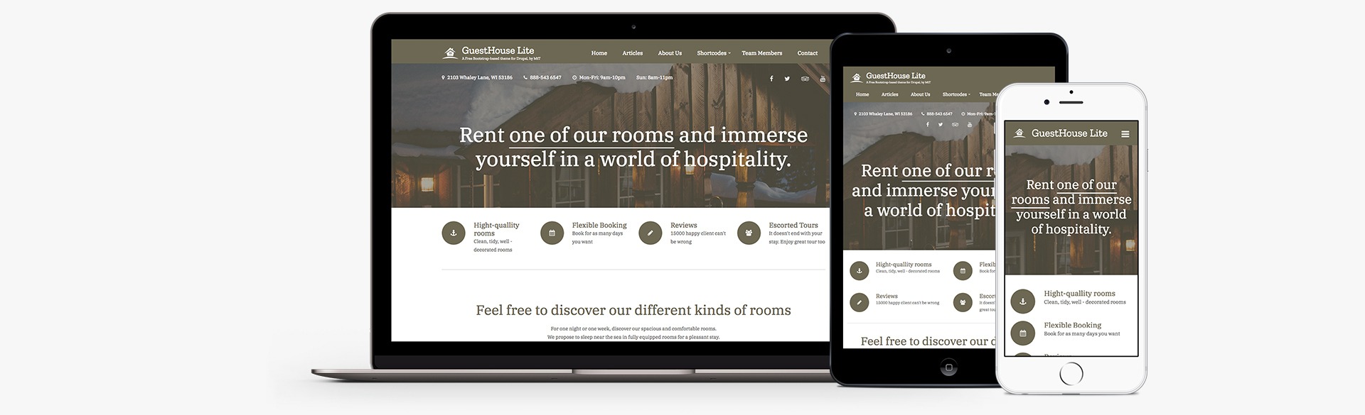Guesthouse Lite is a free Drupal theme to apply on your Drupal website. You can use it as is or customize it for your personal or commercial projects, without limitations. Although attribution is very much appreciated it is not required. Take a look at the Live demo.