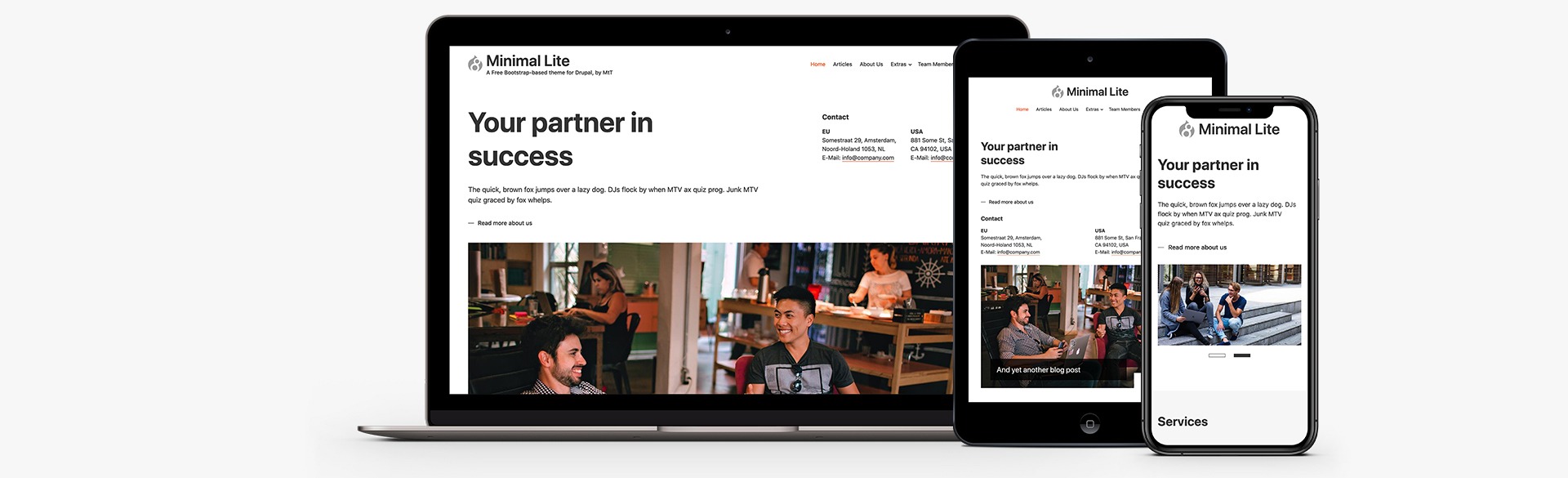 Minimal+ for Drupal is a full-featured mega-theme for corporate and business sites, built on Drupal 8. Minimal+ comes in two versions: a free edition, called Minimal Lite, and a Premium edition, called Minimal+.