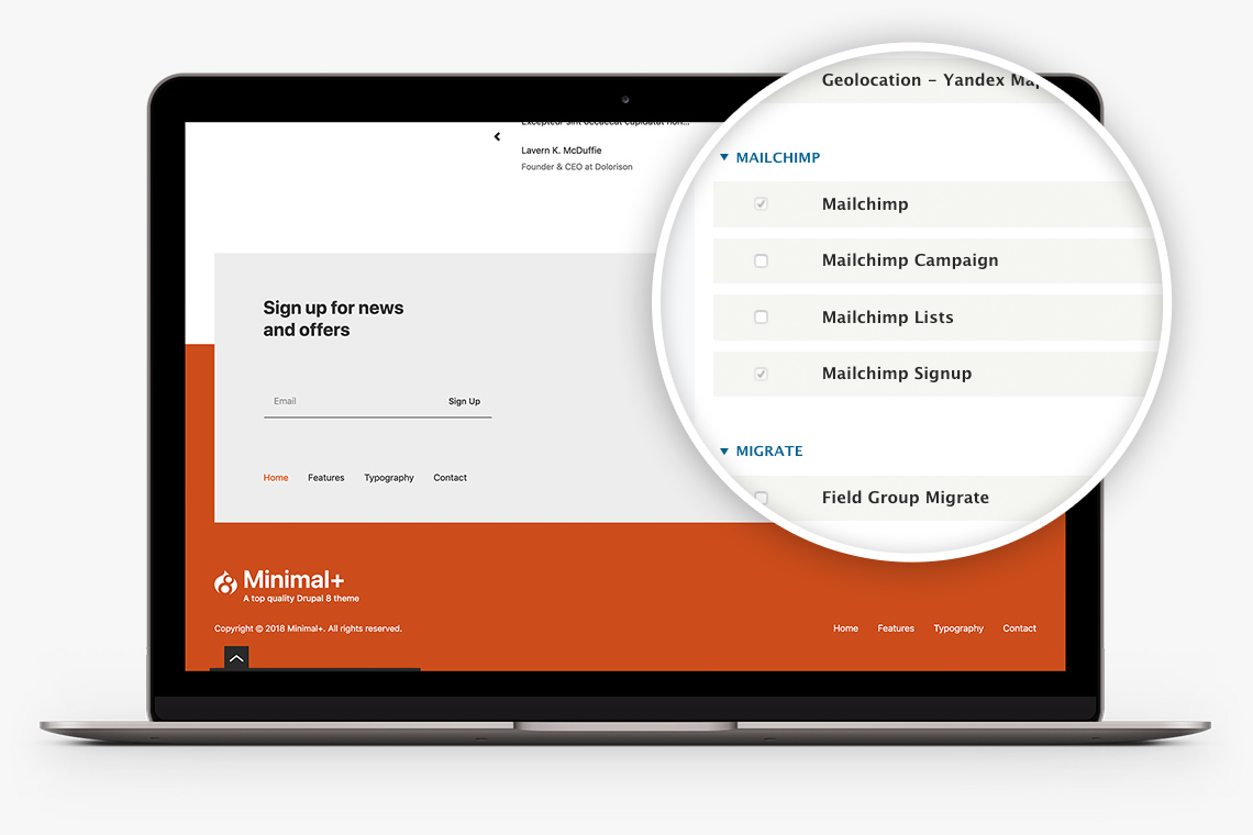 Integrates with Mailchimp using the Drupal module for Mailchimp, providing an out-of-the-box solution for your email marketing needs.