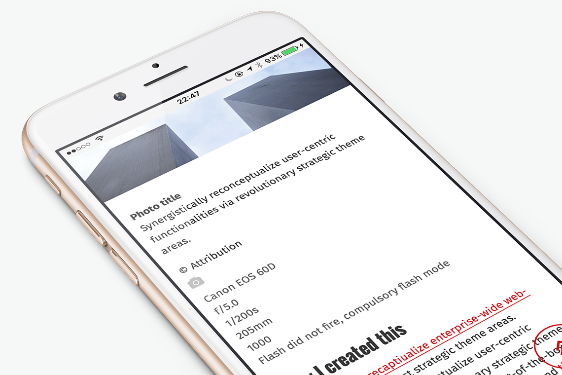 Upload your photo straight from your camera or photo editing app and Portfolio+ will grab and show the settings used while capturing. Choose the license for your work.