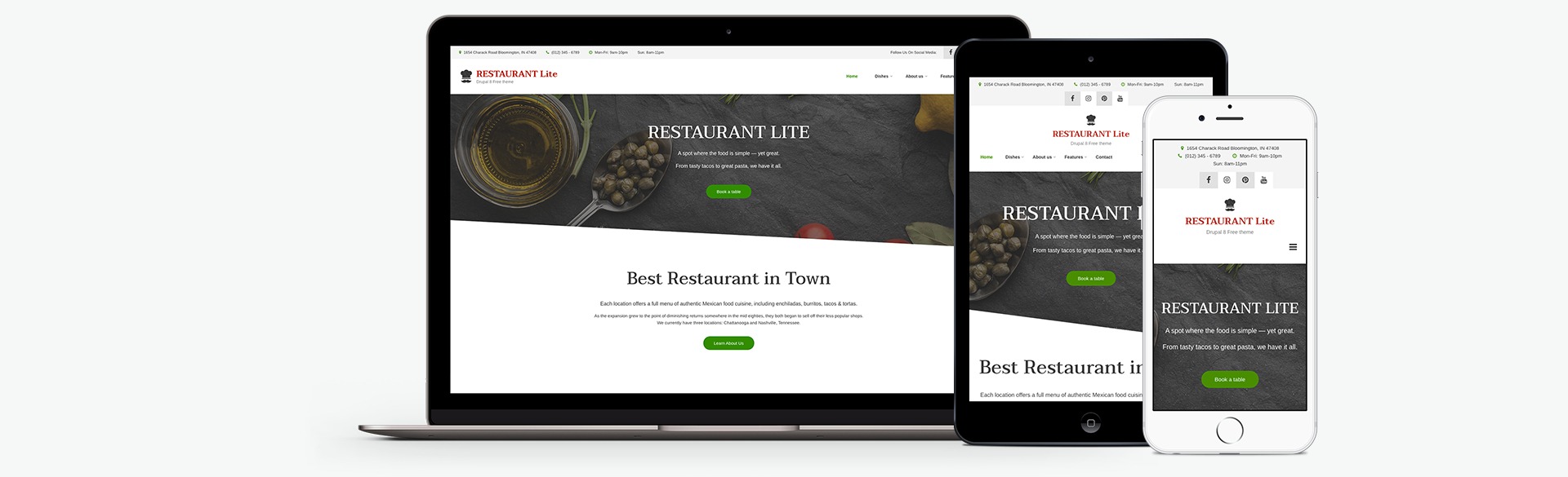 Restaurant Lite is a free Drupal theme to apply on your Drupal website. You can use it as is or customize it for your personal or commercial projects, without limitations. Although attribution is very much appreciated it is not required. Take a look at the Live demo.