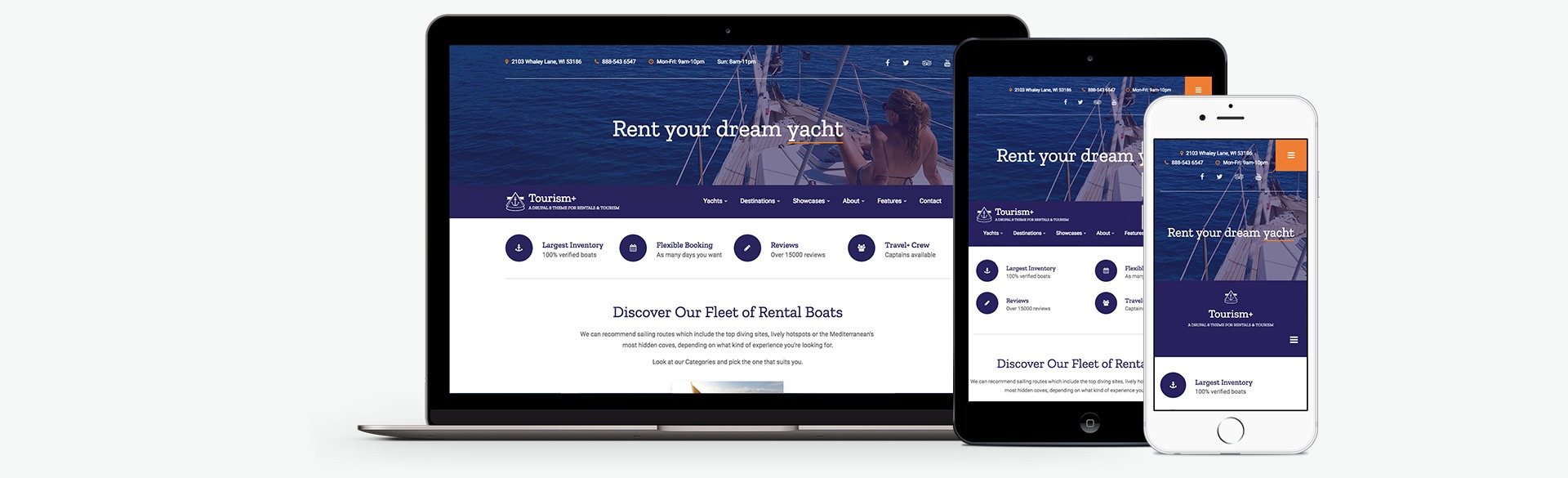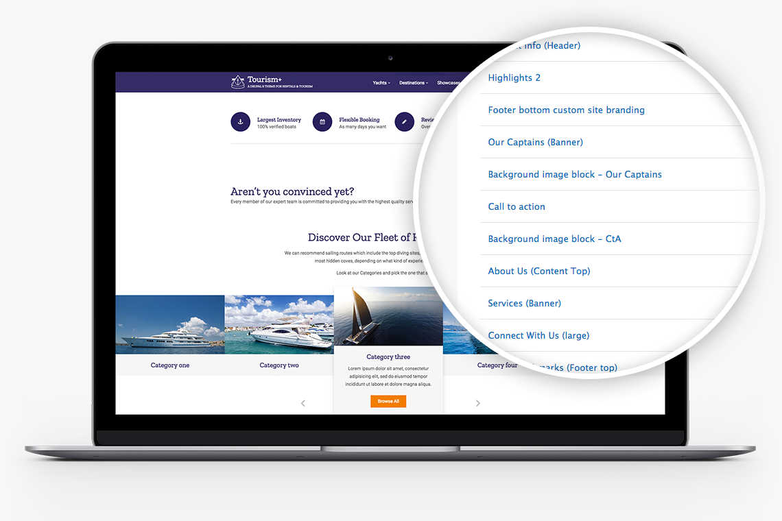 Why build Drupal stuff from scratch? Tourism+ is a great time-saver, with its special Content Types, including: “Yacht” (or any type of rental), “Destination”, “Team member”, “Testimonial” and “Client Showcase”, so you can quickly and easily present what’s great about your business, rentals and destinations.